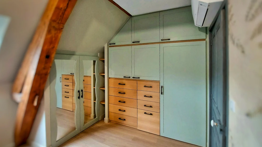 Un dressing sur mesure optimise chaque centimètre de votre espace, même sous pente ou dans des configurations atypiques. Il s'adapte à votre garde-robe et à vos habitudes de rangement. Chez Dumont & Bert, nos artisans conçoivent des aménagements uniques dans notre atelier bourguignon, alliant fonctionnalité et esthétique pour créer un dressing parfaitement adapté à votre quotidien.