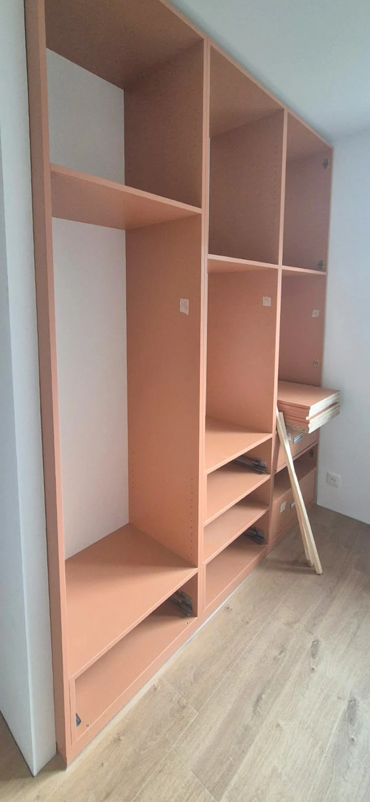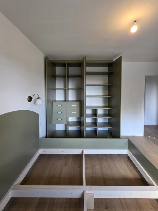 Notre expertise en menuiserie sur mesure permet d'exploiter intelligemment chaque recoin : rangements en hauteur, tiroirs coulissants, penderies modulables et étagères ajustables. Nous étudions précisément vos besoins pour créer un aménagement fonctionnel et aéré. Même dans 5 m², nos artisans conçoivent des solutions ingénieuses qui multiplient votre capacité de rangement tout en préservant la circulation.