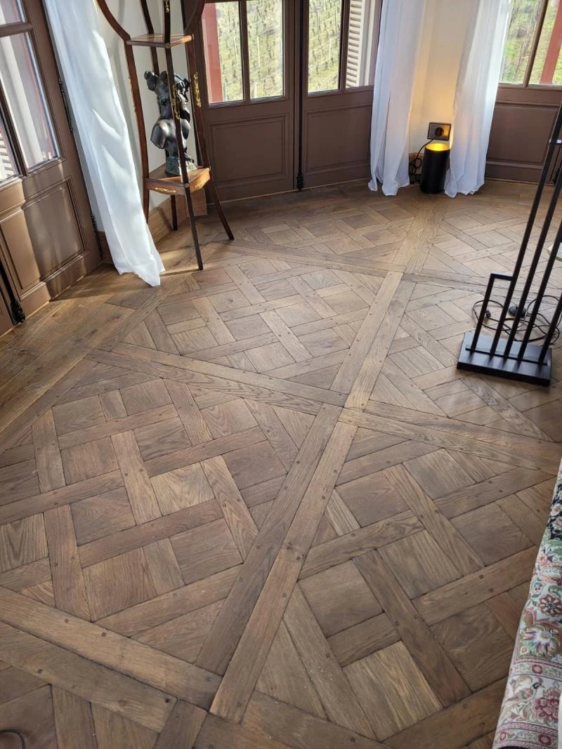Le prix varie selon l'essence choisie, la surface, le type de pose et les finitions. Comptez généralement entre 60 et 150 €/m² pour un parquet massif sur mesure, pose comprise. Les motifs complexes comme le point de Hongrie augmentent le coût. Nous établissons un devis détaillé gratuit après visite de votre domicile. Notre fabrication artisanale garantit un investissement durable qui valorise votre patrimoine.