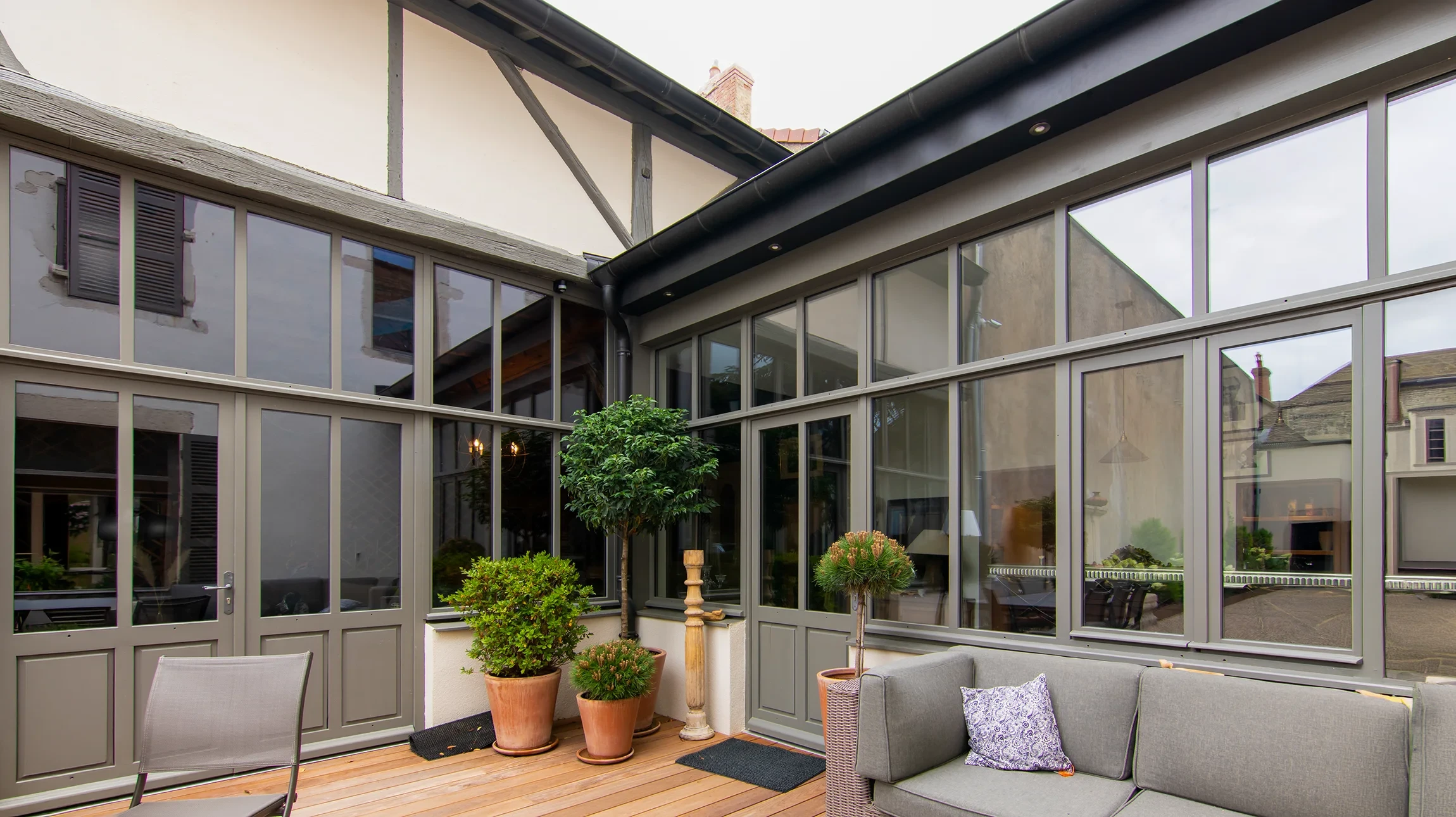 L'entretien est simple : un chiffon microfibre humide pour les vitres et un chiffon sec pour la structure métallique. Pour les verrières en acier, nous recommandons un traitement anti-rouille tous les 2-3 ans. Nos verrières en aluminium ne nécessitent quasiment aucun entretien spécifique.
